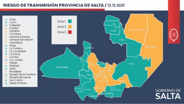 Bajo riesgo sanitario: Santa Victoria; Iruya; Orán; Rosario de la Frontera; Anta; La Caldera; Cafayate; Cachi; La Candelaria; San Carlos; Molinos; La Poma; Los Andes.