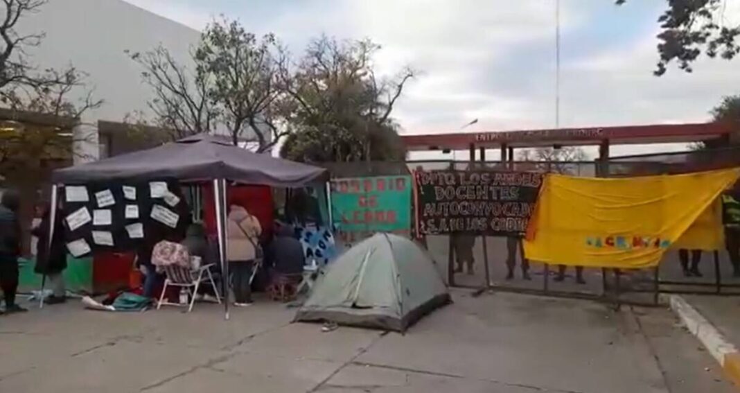 FM Profesional informó este lunes que en asamblea los docentes decidieron permanecer frente al Grand Bourg y comenzaron a cubrir más espacios en la rotonda de ingreso.