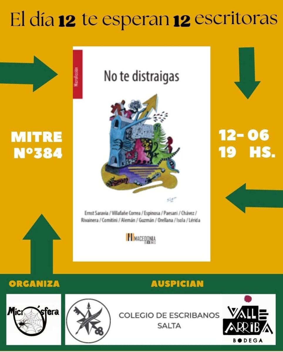 El Colegio de Escribanos de Salta será el escenario donde se presentará «No te distraigas», una antología de microrrelatos que reúne el trabajo de doce escritoras salteñas. El evento tendrá lugar el jueves 12 de junio a las 19 horas en la sede ubicada en Mitre 384.