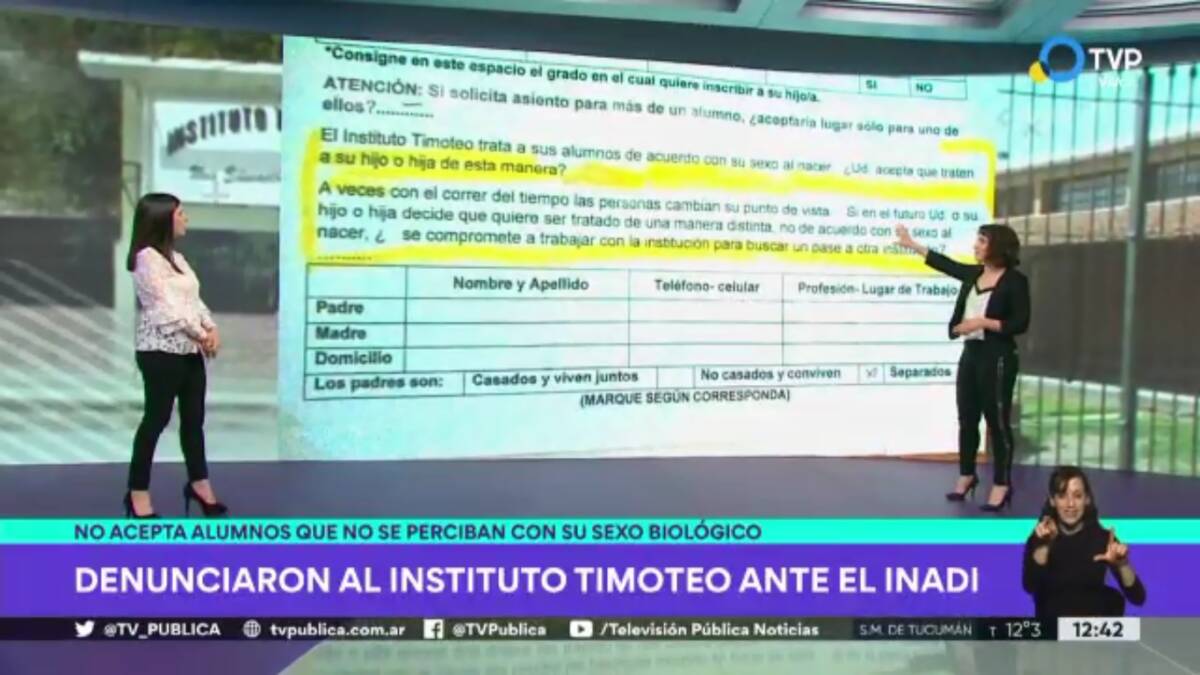En un informe realizado por la TV Pública, las periodistas cuestionaron la normativa que no permite el ingreso al Instituto Timoteo de niños o niñas que se autoperciban de un género distinto al que les asignaron al nacer.