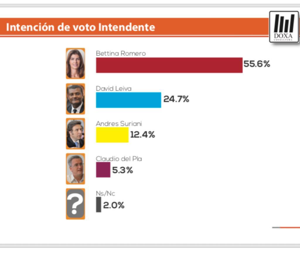 También estuvo cerca de los números reales de Bettina Romero. Doxa anunció una intención de voto del 55,6 por ciento, tres puntos de diferencia. A Leiva le daba 24,7 de intención de voto, una diferencia menor a los tres puntos con los resultados del escrutinio.