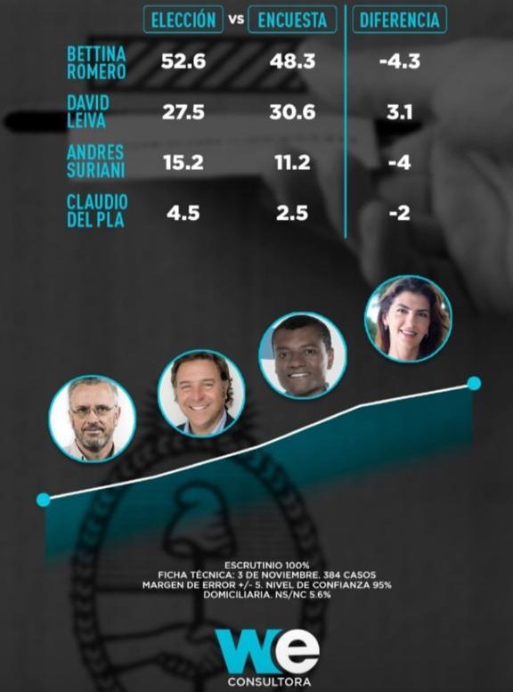 We, consultora de Benjamín Gebhard, pronosticó que Bettina Romero sería electa intendenta con el 48,3 por ciento. El domingo obtuvo 52,6, una diferencia de 4,3. La misma encuesta le daba 30,6 puntos a David Leiva, quien logró 27,5 (diferencia de 3,1).