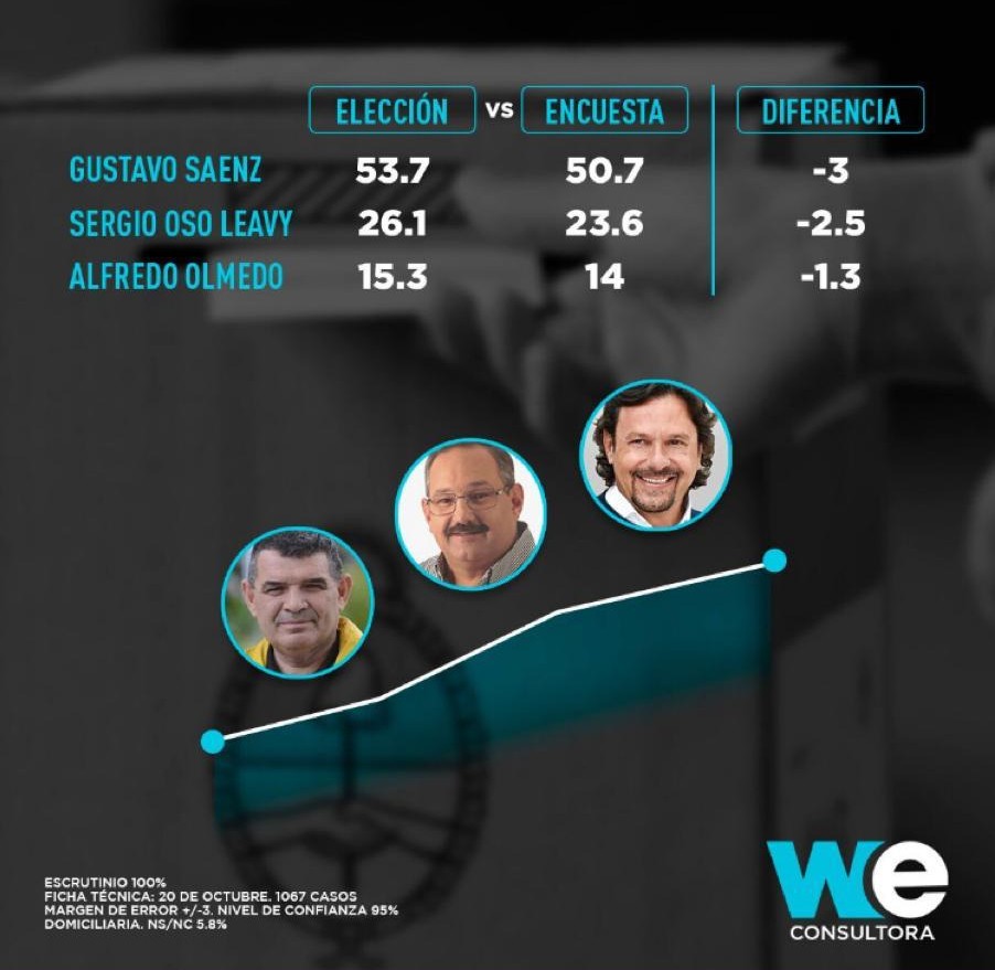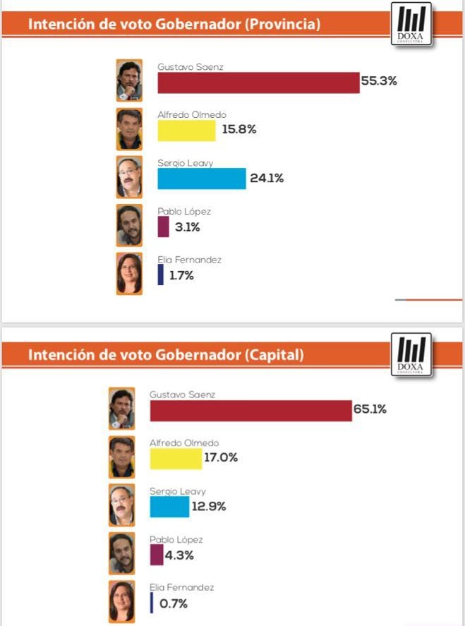 En el caso de los candidatos a gobernador, la misma consultora había arriesgado un triunfo de Gustavo Sáenz con el 50,7 por ciento. Sáenz obtuvo el 53,7 por ciento de los votos, una diferencia de 3 puntos.