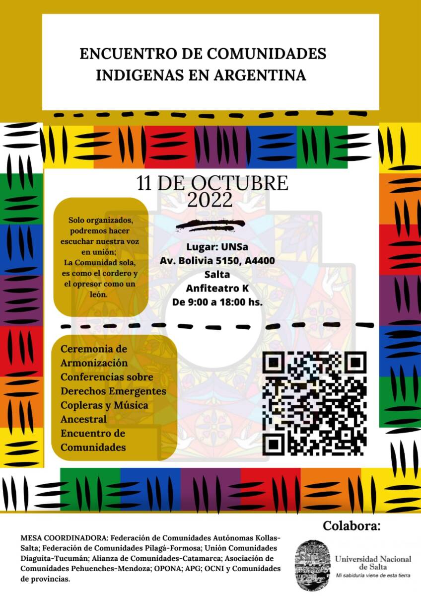 Este martes 11 de octubre se llevará a cabo el Encuentro de Comunidades Indígenas en Argentina. Será en el Anfiteatro K de la Universidad Nacional de Salta (UNSa) a partir de las 9 y hasta las 18.