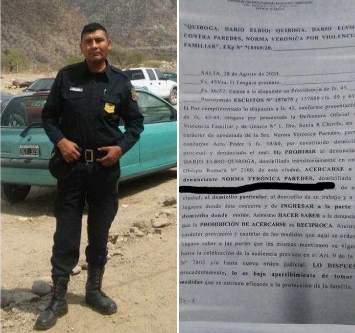 Se trata del sargento ayudante Elbio Darío Quiroga, quien desde 2015 ha sido denunciado constantemente por su expareja, Verónica Paredes, al punto que consiguió la restricción de acercamiento. De todas maneras eso no impidió al agresor se metiera en el domicilio de Paredes “junto a dos mujeres y tres menores cuando ella llevaba a su hijo a la escuela”, señala el medio Agenda Salta.