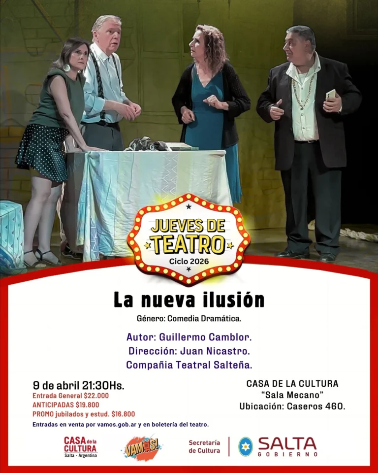 La Compañía Teatral Salteña pondrá en escena este jueves 9 de abril «La nueva ilusión», comedia dramática escrita por Guillermo Camblor y dirigida por Juan Nicastro. La obra forma parte del ciclo de teatro que se desarrolla cada jueves en la Casa de la Cultura.