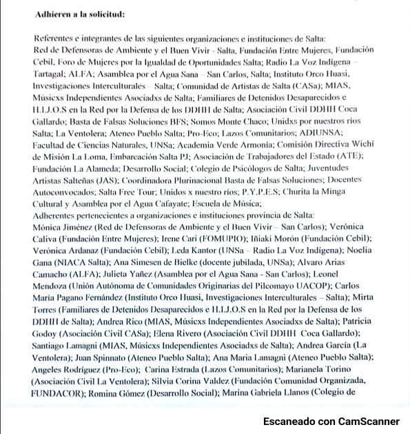 “La masiva respuesta de representantes e integrantes de comunidades, instituciones y organizaciones sociales, académicas, científicas, ambientalistas, culturales, políticas, feministas, artísticas y de DDHH, de Salta, el país y Latinoamérica, demuestran la importancia que la sociedad da a los bosques, el cambio climático y los derechos humanos”, destacan los organizadores de la medida.