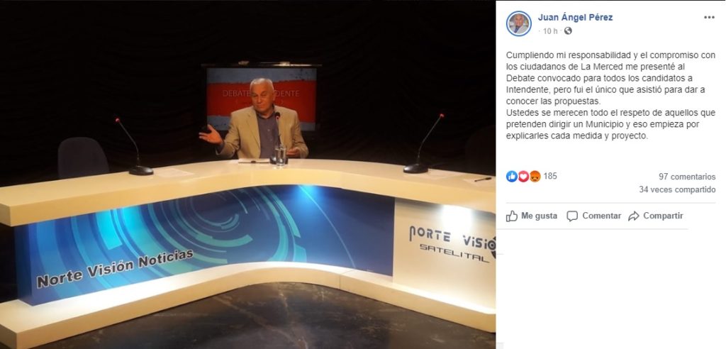 «Cumpliendo mi responsabilidad y el compromiso con los ciudadanos de La Merced me presenté al Debate convocado para todos los candidatos a Intendente, pero fui el único que asistió para dar a conocer las propuestas», escribió Pérez, que lleva más de veinte años al frente de la municipalidad. «Ustedes se merecen todo el respeto de aquellos que pretenden dirigir un Municipio y eso empieza por explicarles cada medida y proyecto», agregó.