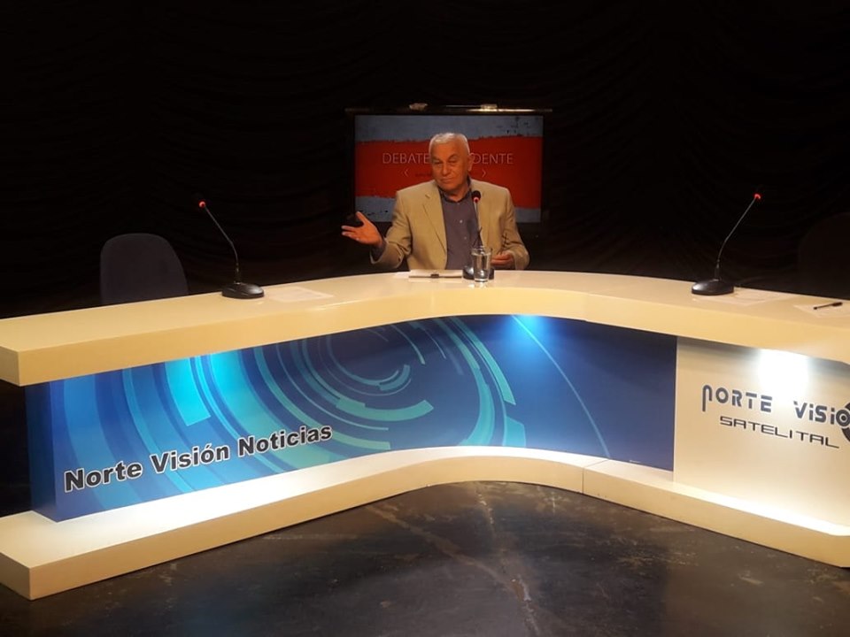 En la foto, Pérez posa en soledad en el estudio de Norte Visión y apunta contra uno de los asientos vacíos, en un gesto que podría interpretarse como la muestra de la falta de compromiso de sus rivales. Lo cierto es que Wayar, que en las PASO sacó apenas 120 votos menos que el intendente, estaba siendo golpeado y sufría el incendio de su casa en ese mismo momento.