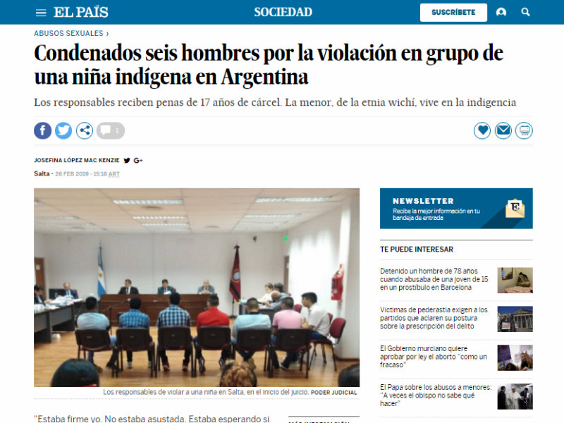 “Desde entonces, Francisca lidió con un Estado ausente y logró una condena ejemplar para los culpables. El lunes, antes de lo previsto, un tribunal de la ciudad de Tartagal condenó a 17 años de cárcel efectiva a seis hombres por el abuso sexual con acceso carnal de la niña (…) Otros dos acusados eran menores cuando participaron de la violación en manada y fueron derivados a la justicia juvenil. La actuación —en grupo y con menores— y el uso de violencia física agravaron el delito” enfatizó el diario español en su edición de hoy que recordó que “los wichís soltaron un puñado de palabras cada uno, pero sin apartarse de una idea colectiva: “Ha sido violación, que haya justicia”.