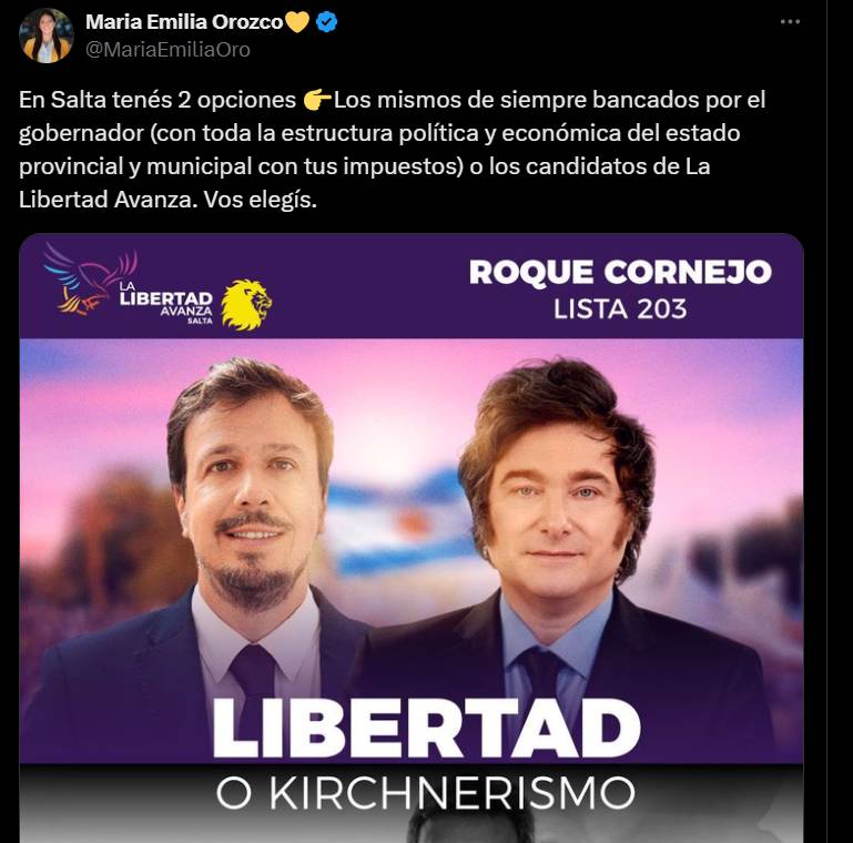 Sin embargo, para los libertarios salteños, la estrategia es decir que todo es kirchnerista. «En Salta tenés 2 opciones. Los mismos de siempre bancados por el gobernador (con toda la estructura política y económica del estado provincial y municipal con tus impuestos) o los candidatos de La Libertad Avanza. Vos elegís», escribió la diputada nacional Emilia Orozco en sus redes, junto a la imagen de Cornejo. ¿Nos toman por tontos? Usted decide.