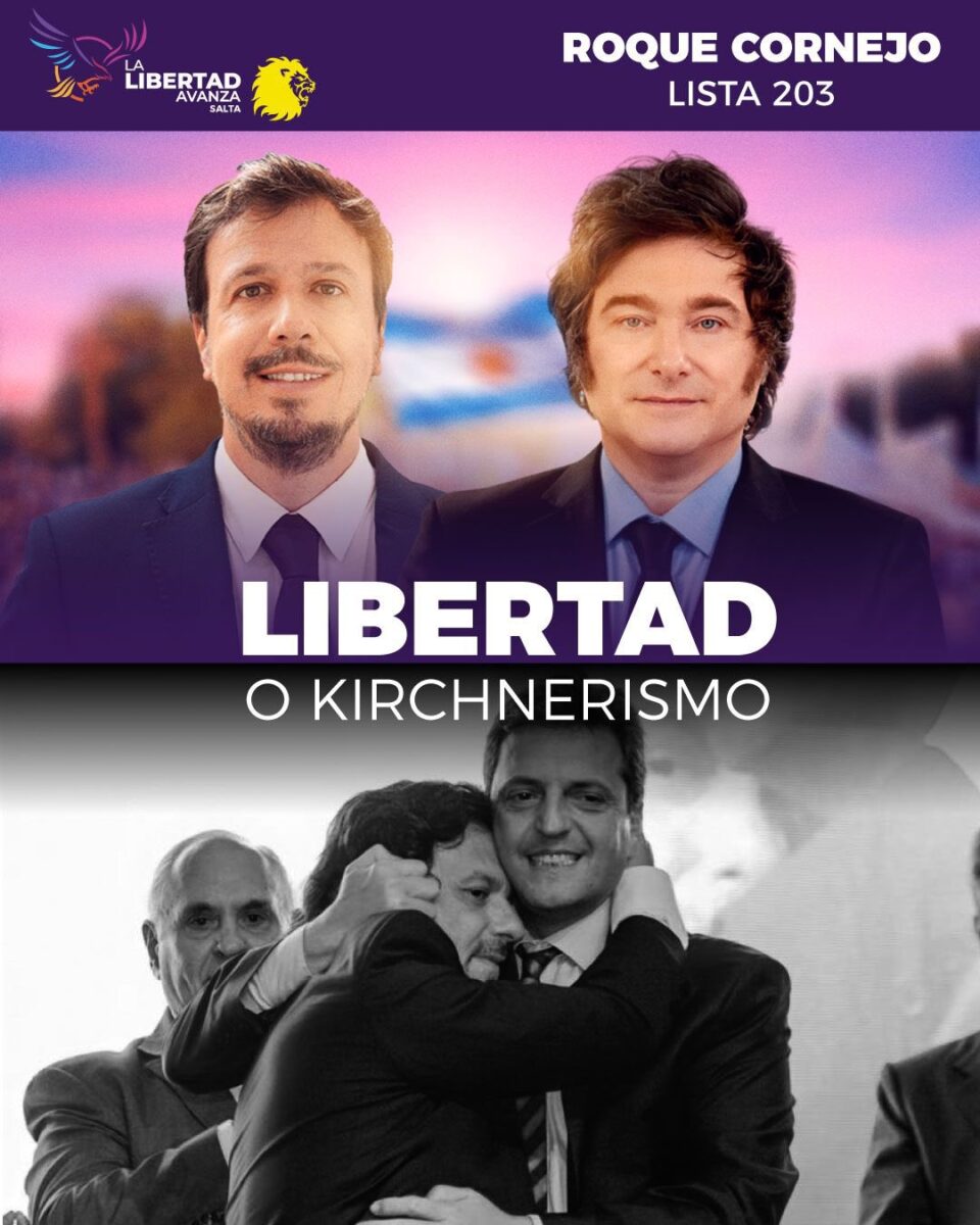 Quedará en el lector inclinarse o no por alguna de esas opciones. Mientras tanto, para ayudar a decidir dejamos en su consideración un afiche difundido en los últimos días por los dirigentes libertarios. Allí se ve al candidato a senador provincial, Roque Cornejo, junto al presidente Javier Milei. Debajo hay otra foto: la de Gustavo Sáenz abrazado a Sergio Massa. Las imágenes están acompañadas por una leyenda contundente: «Libertad o kirchnerismo».