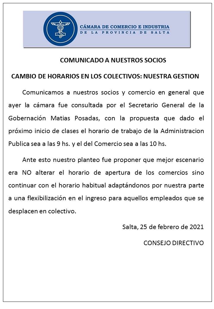En un comunicado difundido en las últimas horas, la Cámara de Comercio de Salta solicitó a los negocios de la ciudad que se flexibilice el ingreso de algunos empleados para garantizar el transporte público para docentes y alumnos.