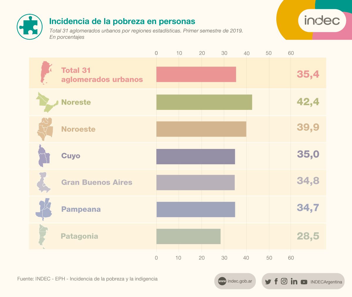 A la hora de discriminar la situación por regiones, los números indican que la región más afectada es el NEA con un índice del 42,4%, le sigue el NOA con 39,9%; luego Cuyo con 35%: seguida del Gran Buenos Aires con 34,8%; la región pampeana con 34,7% y la Patagonia con 28,5%.