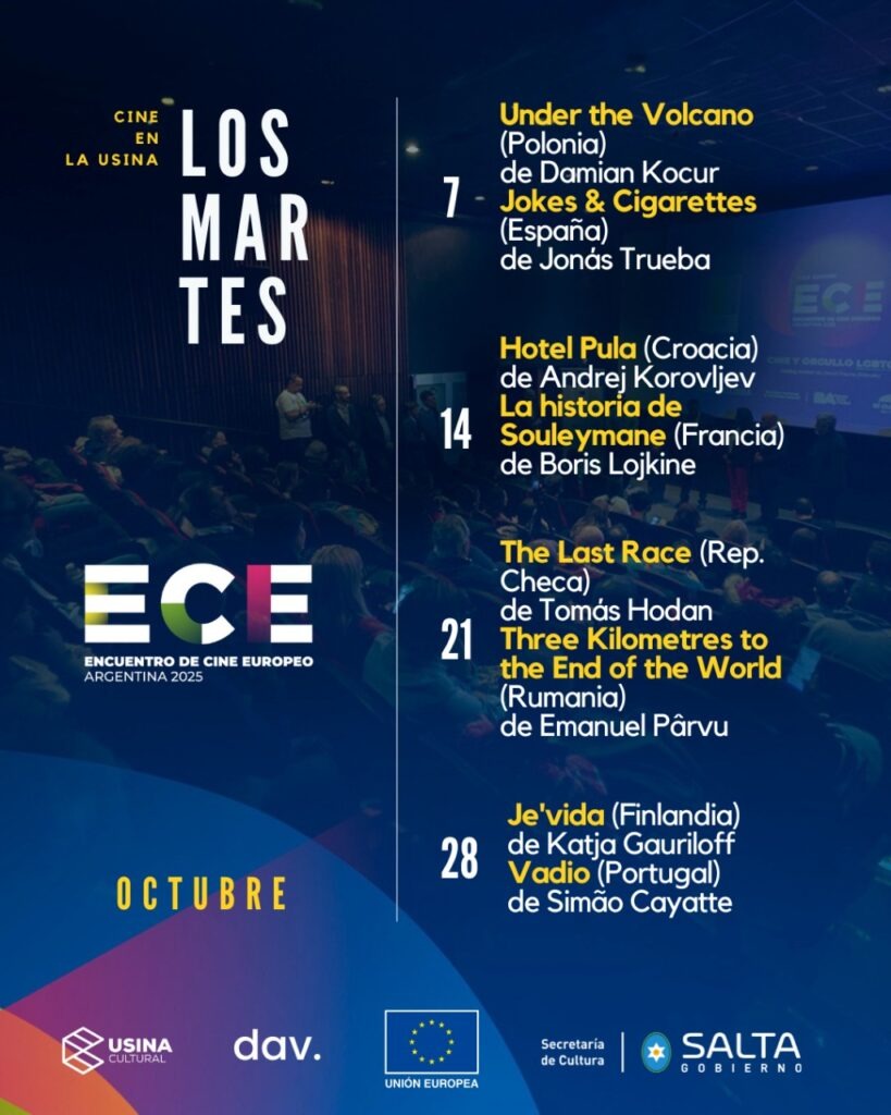 El XXI Encuentro de Cine Europeo en Argentina arranca en Salta el martes 7 de octubre con proyecciones gratuitas en el Auditorio de la Usina Cultural. La actividad forma parte del ciclo «Los Martes» que organiza la Dirección de Audiovisuales de la Secretaría de Cultura de la Provincia y permitirá al público salteño acceder a producciones cinematográficas contemporáneas europeas en pantalla grande.