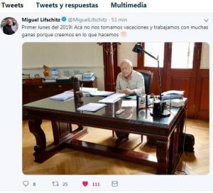 “Primer lunes del 2019! Acá no nos tomamos vacaciones y trabajamos con muchas ganas porque creemos en lo que hacemos” escribió en Twitter el mandatario santafecino junto a una fotografía sentado frente a su escritorio de trabajo.
